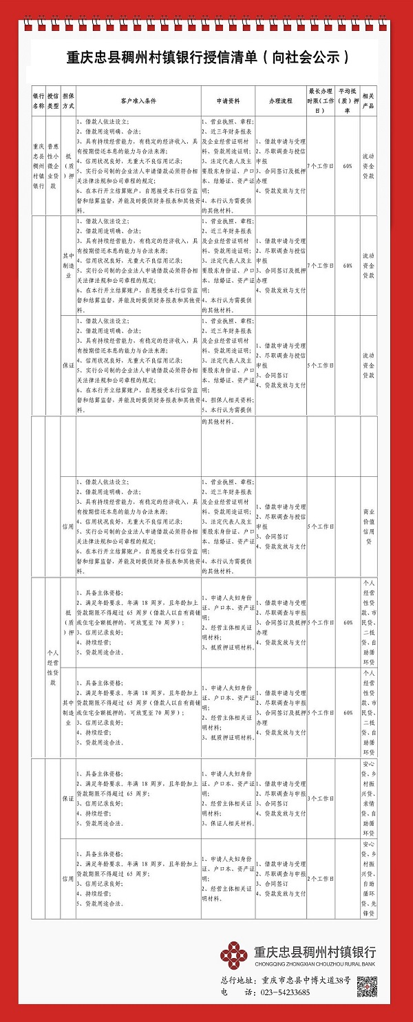重庆忠县稠州村镇银行授信清单公示